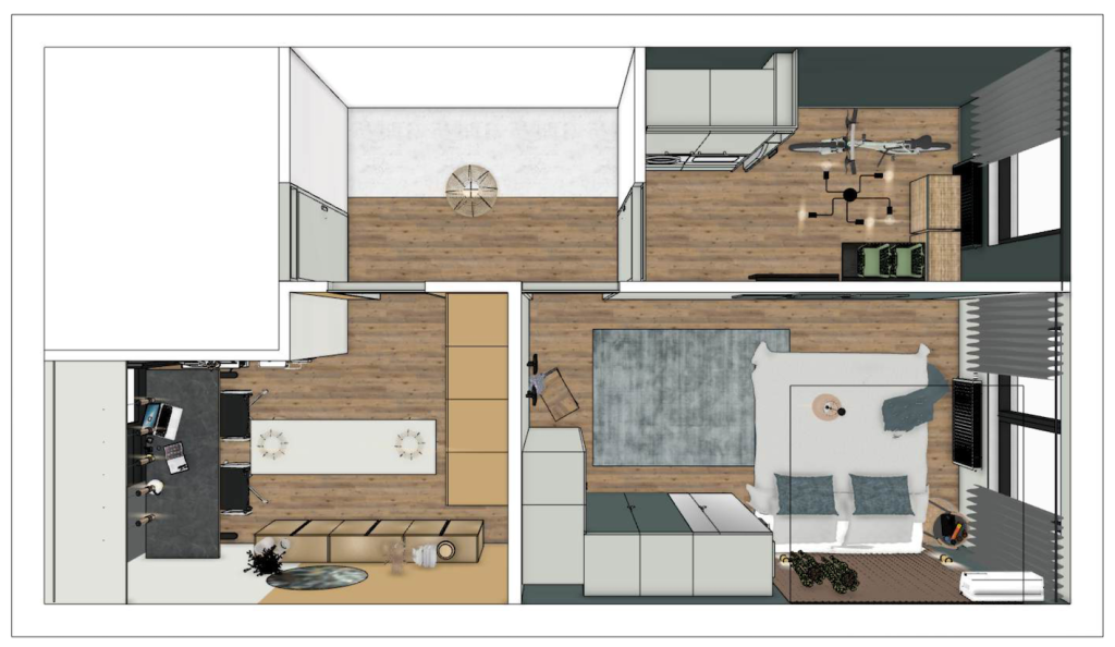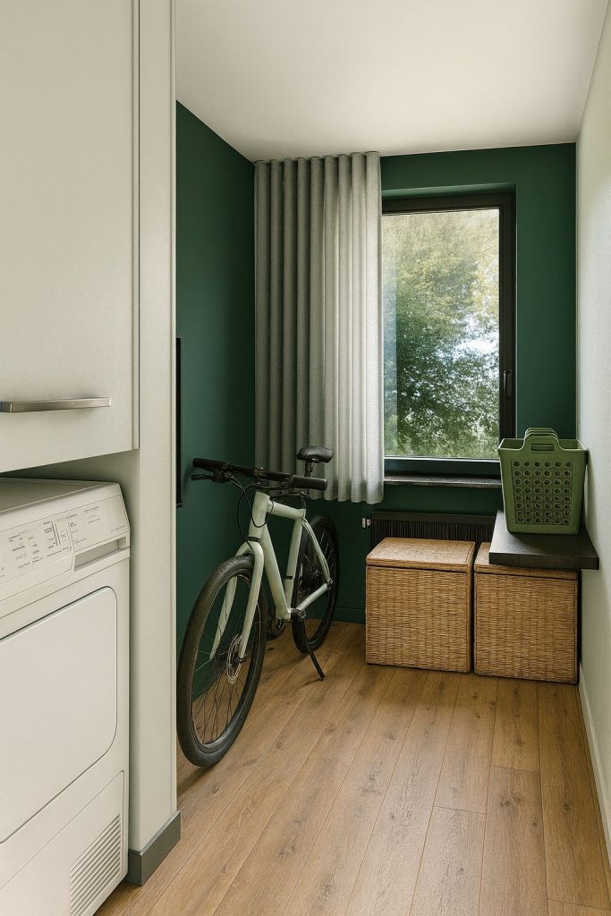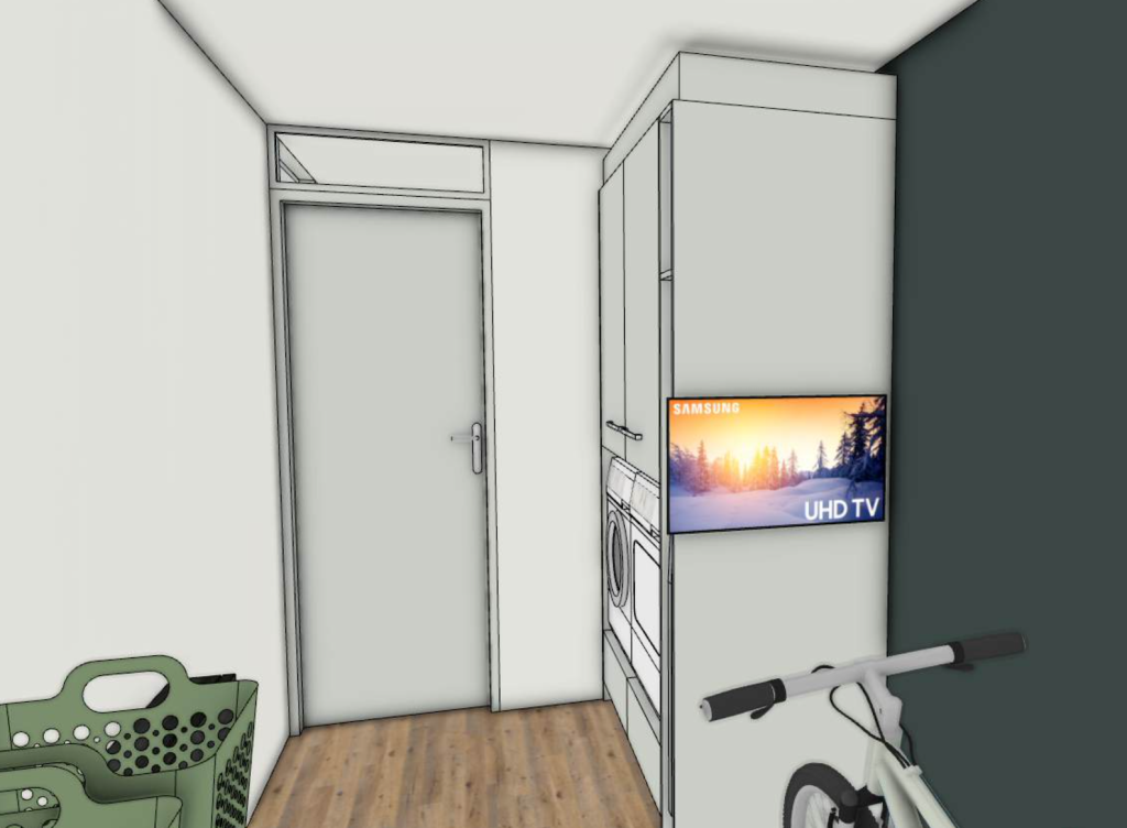 De kinderen krijgen de hele zolder en de ouderslaapkamer blijft op dezelfde plek. De wasmachine, droger en sportfiets gaan naar de kleinste kamer op de eerste verdieping. De werkruimte komt in de kamer aan de voorzijde.