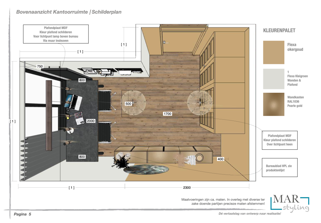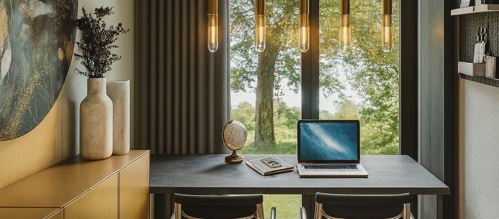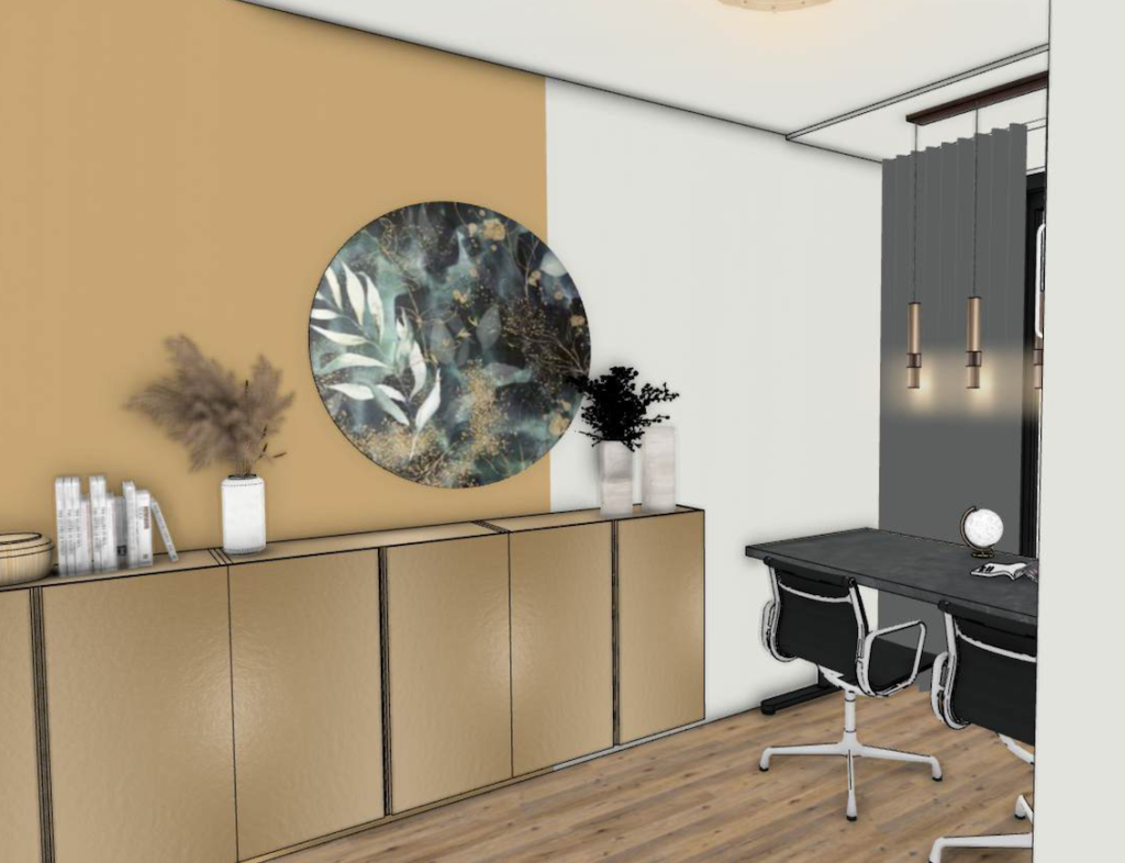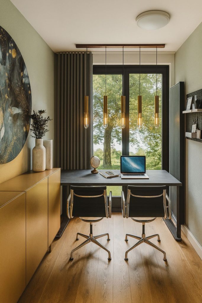 De werkkamer heeft plek voor twee, een grote opbergkast en lage hangende kasten in een goudtint. Zo blijft het ruimtelijk en is er toch veel opbergruimte achter deuren.