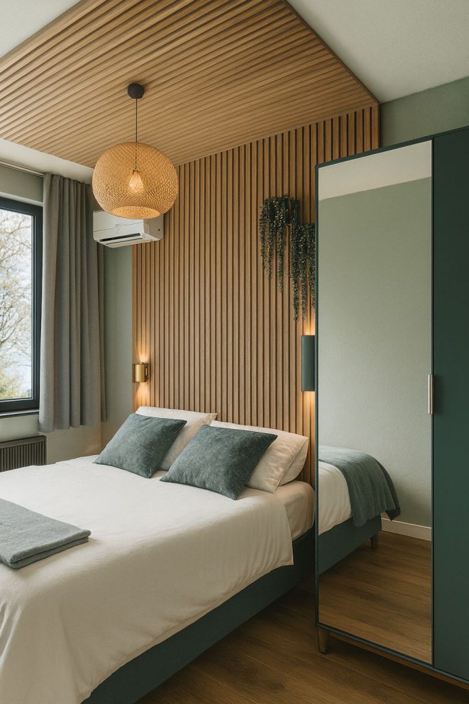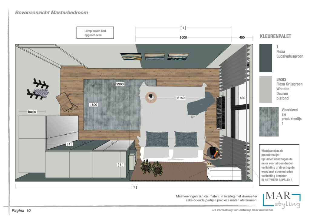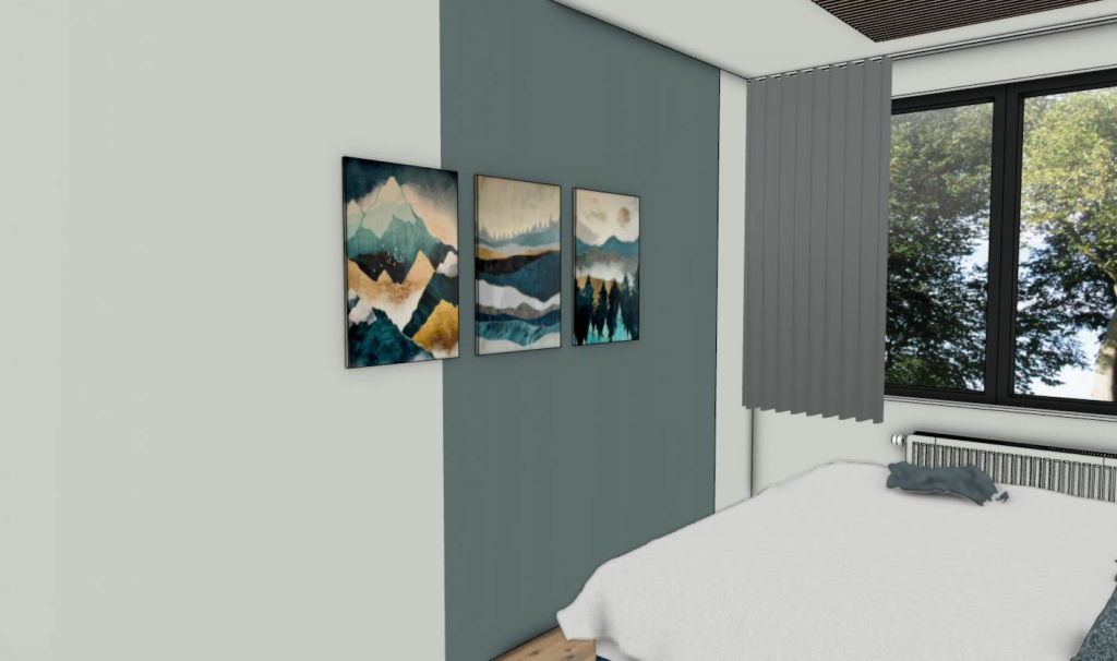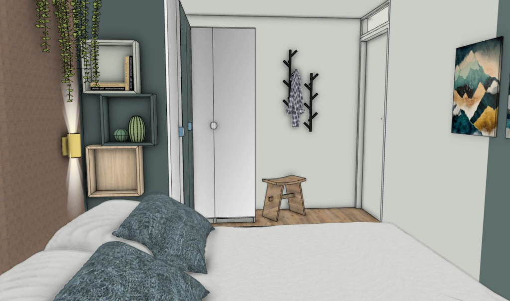 De ouder slaapkamer heeft nieuwe elementen gekregen, als de bedachterwand, plafondafwerking, tafeltjes en schappen als nachtkastjes. De wanden worden op kleur gesaust en de bestaande kledingkast wordt ook voorzien van nieuwe kleuren.