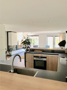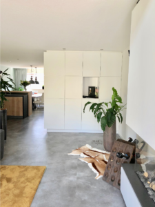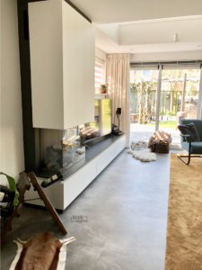 MarStyling heeft diverse (maatwerk)meubels ontworpen zoals de keuken, de haard, de wandkast met aan de aan de keukenzijde de deur voor de koelkast. Mooi onzichtbaar als koelkast en de keuken blijft hierdoor mooi laag. Aan de eetkamerzijde is er kastruimte in de keuken en aan de kamerzijde staan barstoelen. Met een feestje of als het hele gezin compleet is, is het gezellig staan, zitten en hangen rond de keuken. Het centrale punt in de ruimte.