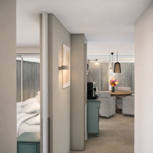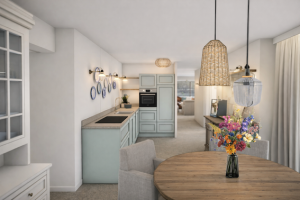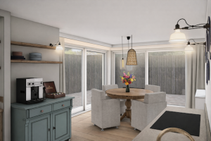 Zo is de voormalige woonkamer de zitkamer geworden en de voormalige keuken uitgebouwd tot een ruime woonkeuken.