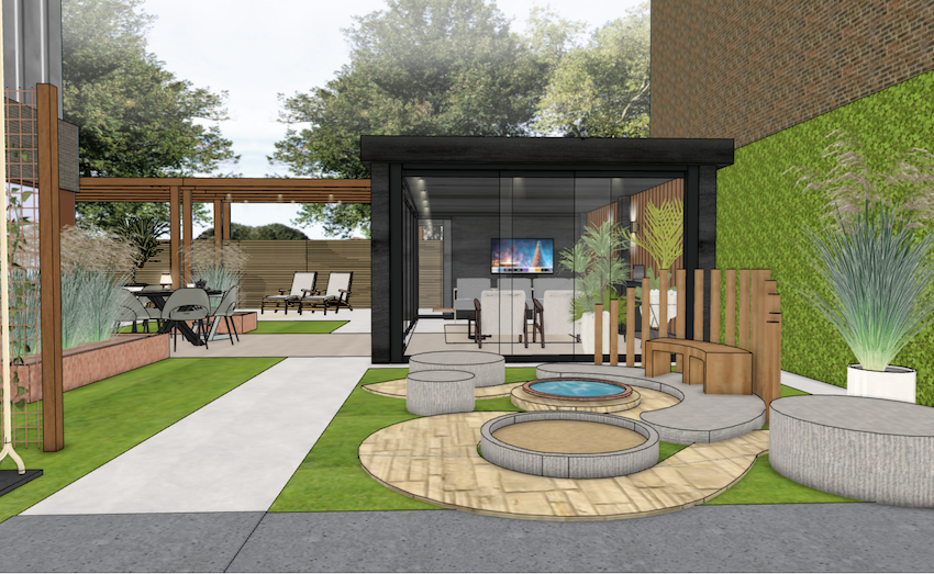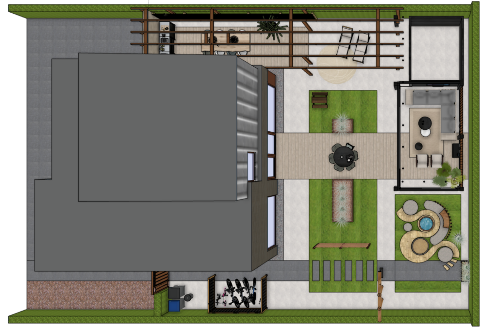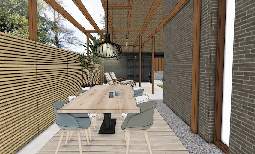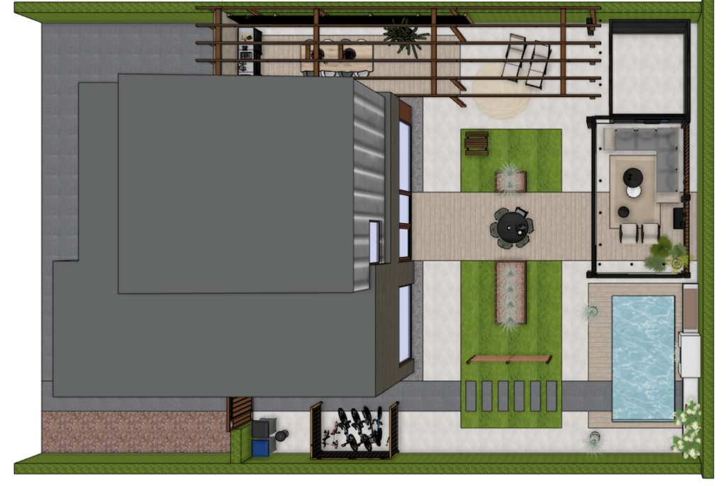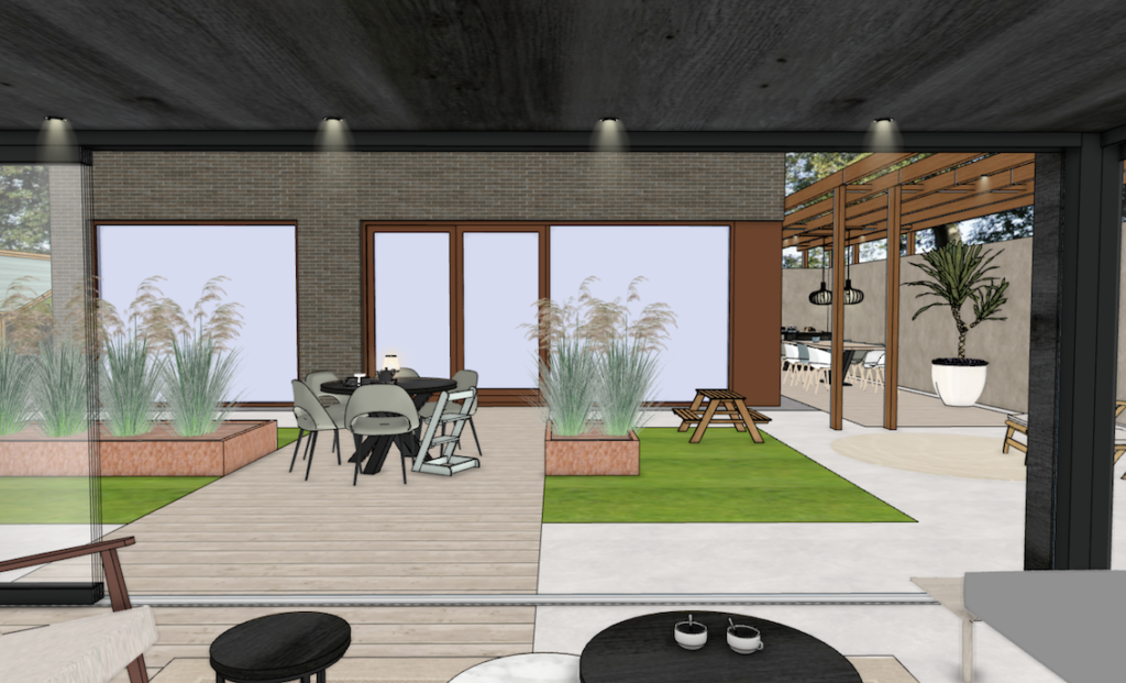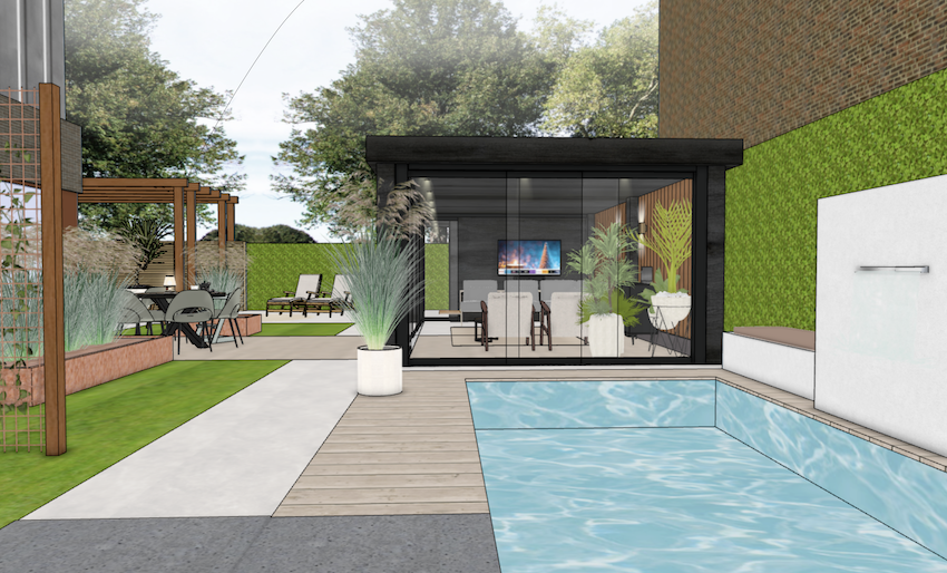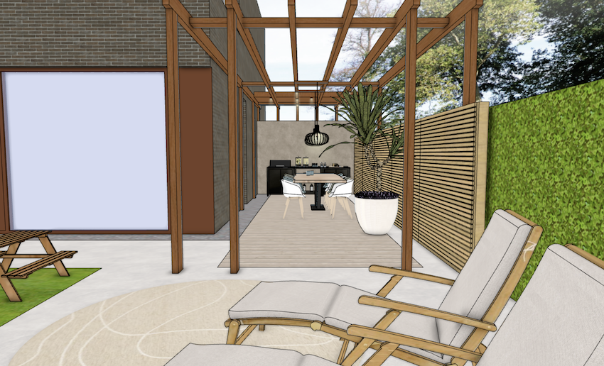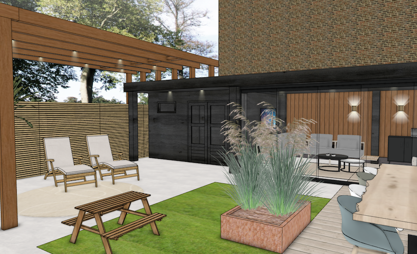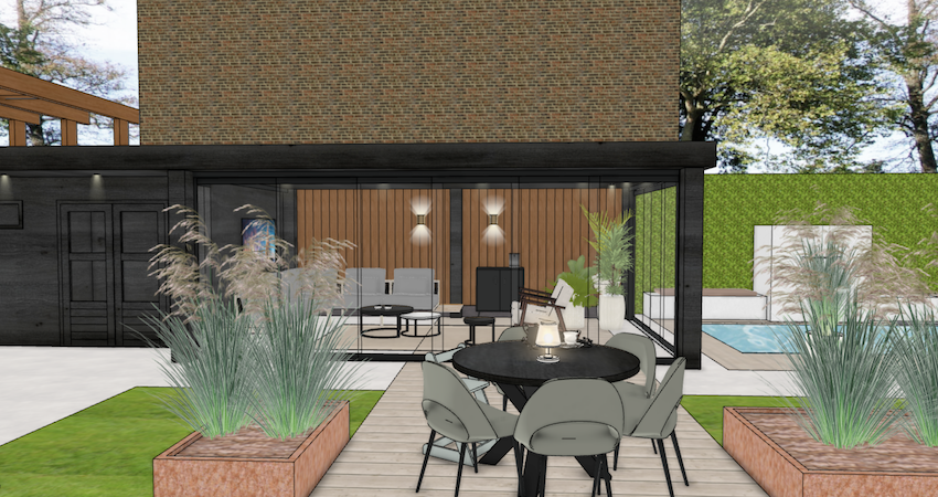 Loungen, eten, spelen, in de zomer ruimte voor een opzet zwembad, een overkapping en groen dat goed en gemakkelijk te onderhouden is. Dat waren de wensen qua gebruik van de tuin.