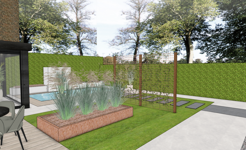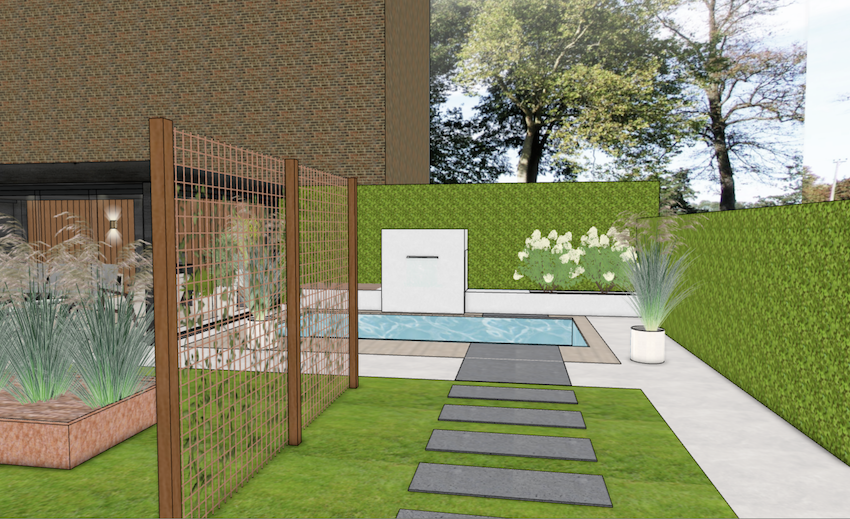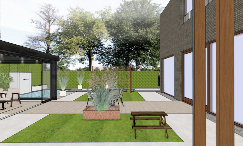 Het deel van de tuin waar het speelgedeelte gemaakt wordt, kan over een aantal jaar gemakkelijk omgebouwd worden naar de hoek waar een vast compact zwembad past. Dit zonder de hele tuin opnieuw aan te hoeven pakken.